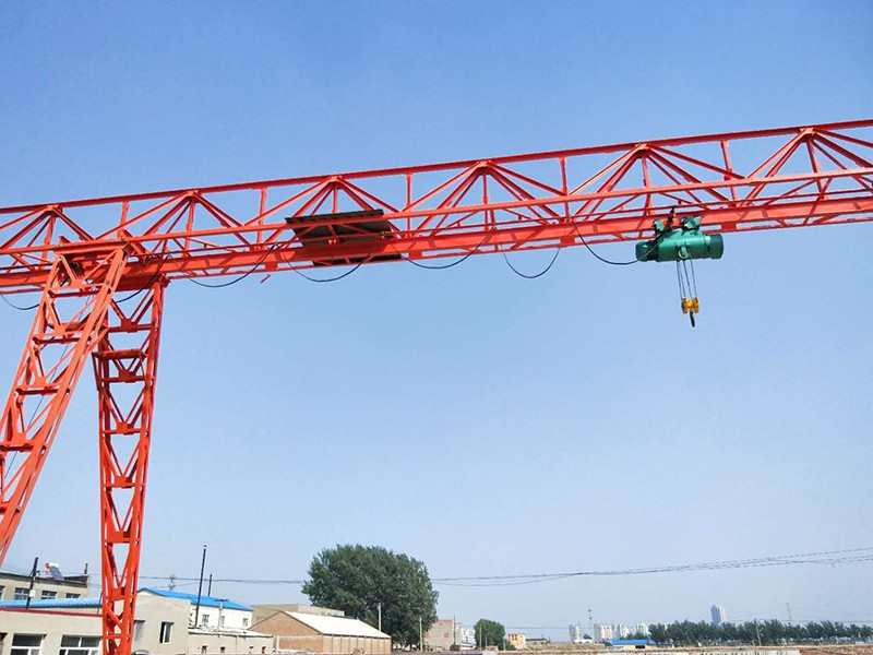 它的金屬結(jié)構(gòu)像門形框架,承載主梁下安裝兩條支腳,可以直接在地面的軌道上行走,主梁兩端可以具有外伸懸臂梁。